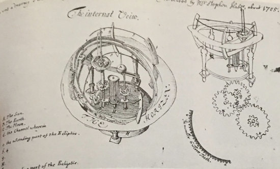 Stukeley’s drawing of Hales’ orrery. It bears the inscription: ‘This was a drawing I made at CCCC from a machine invented and executed by Mr. Stephen Hales, about 1705.’ Via Geared to the Stars (01978).