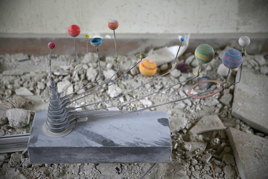 In one of Khabieh’s photographs, a damaged orrery stands amidst the dusty rubble, the plastic sphere of Earth dislodged from its mount.