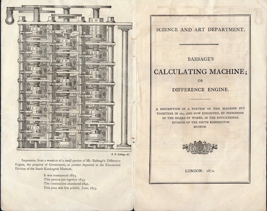 A wood-engraved frontispiece illustrating “a small portion of Mr Babbage’s Difference Engine,” (01872). Via Hordern House.