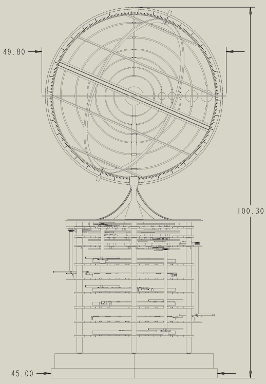 The prototype is designed to update each planet’s position twice a day, providing something of a kinetic sculpture of the Long Now as a time scale: Mercury completes one revolution in about 88 days; the Earth takes exactly one solar year; Saturn makes it around the Sun in just under thirty years.